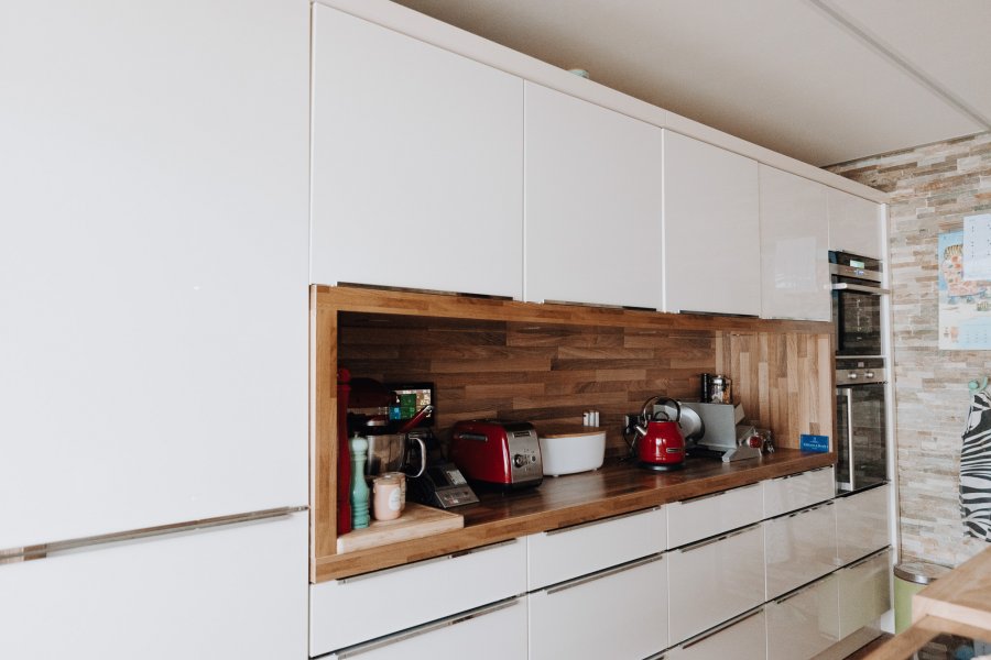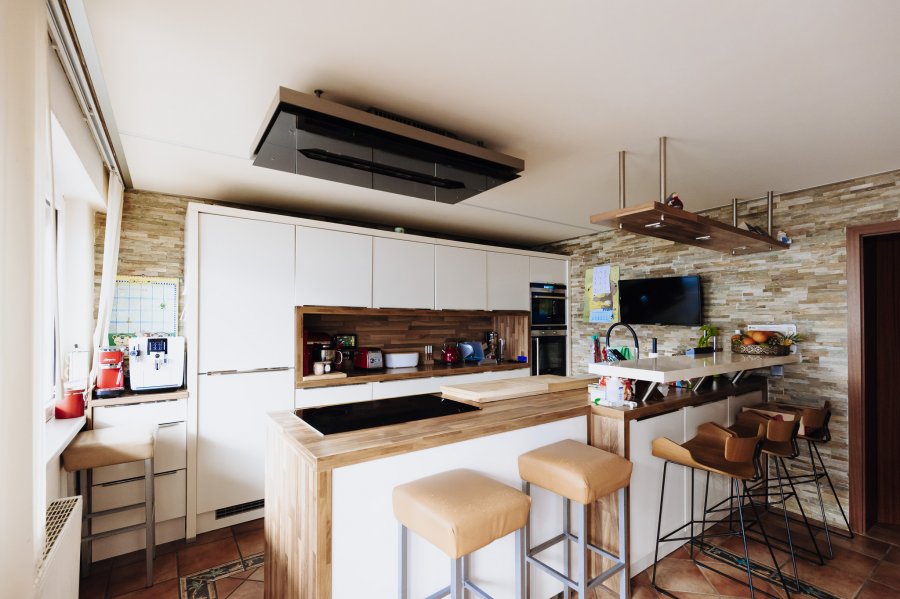Über das Treppenhaus gelangt man vom Erdgeschoss in das Obergeschoss. Oben angekommen, befindet man sich zunächst im Flur, von dem aus die verschiedenen Räume zugänglich sind. Auf der rechten Seite liegt ein Gäste-WC. Geradeaus öffnet sich der Zugang zur Küche, die großzügig gestaltet ist und durch ihre hochwertige Ausstattung sowie viel Arbeitsfläche einen zentralen Treffpunkt im Haus bildet. Von hier aus besteht direkter Zugang zum Balkon. Ein Kachelofen ist in diesen Bereich integriert und sorgt für eine angenehme Wärme sowie eine gemütliche Atmosphäre. Angrenzend an die Küche gelangt man in das Esszimmer, das ausreichend Platz für einen großen Esstisch bietet und sich gut als gemeinsamer Mittelpunkt des Wohnens eignet. Auf dieser Etage befinden sich außerdem ein Badezimmer mit Eckbadewanne, ein Schlafzimmer sowie der Zugang über eine Treppe in den Gartenbereich.